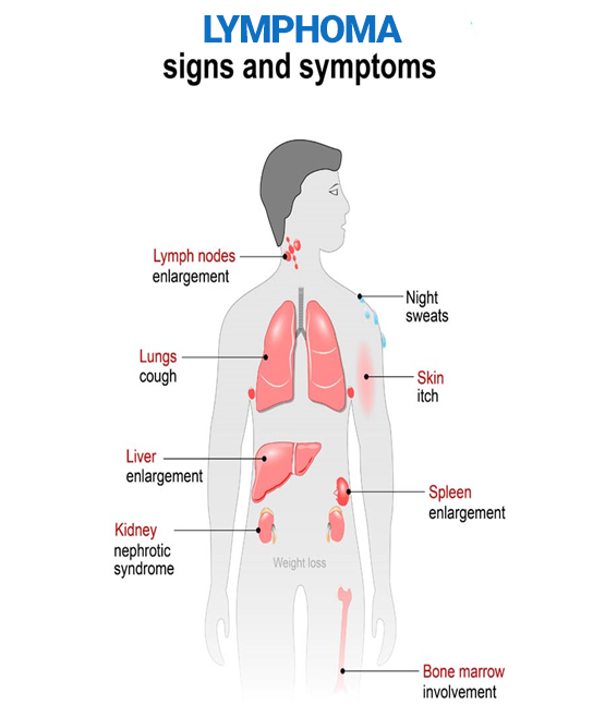 There are lots of symptoms associated with non-Hodgkin’s lymphoma. Keep a close watch for any of the following: shortness of breath; wheezing and coughing; swelling of the lymph nodes; swelling, fluid accumulation, or pain in the abdomen; sudden weight loss; fatigue; weakness; night sweats; chills or fever.